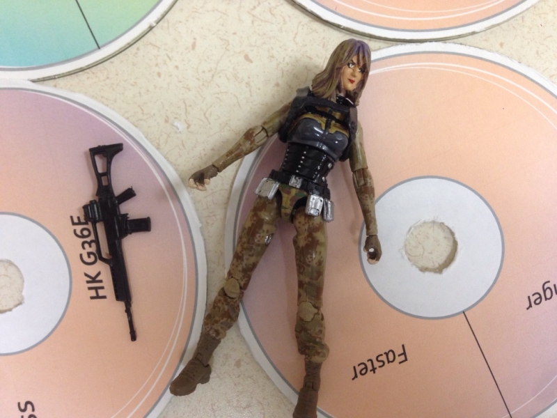 This figure is for the second session of the game, which occurs in an earlier time frame than the first session. Thus, the figure is more basic, with less gear and battle weariness. I thought it appropriate to the character to have a touch of personality, and gave her a touch of purple hair.