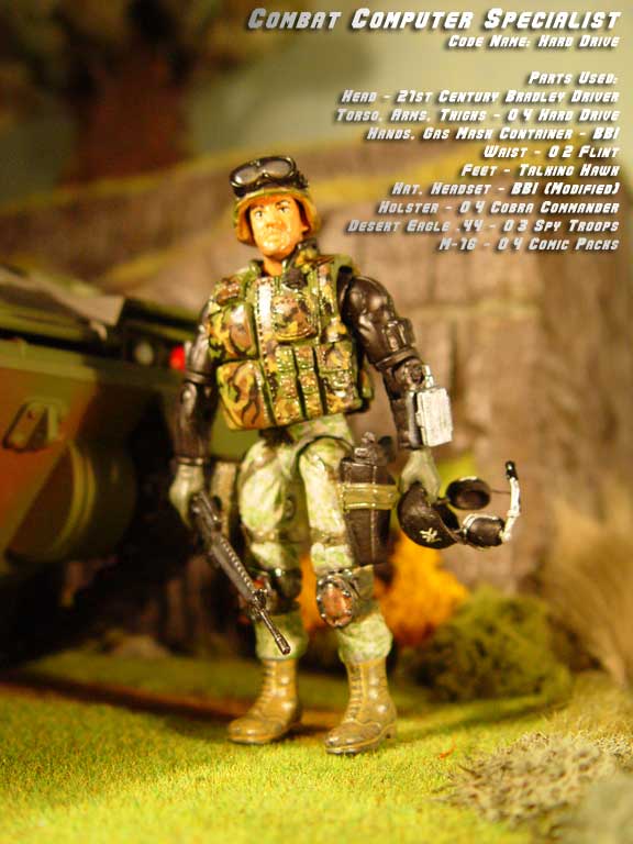 After finally taking the plunge and making a new sculpt custom for my abandoned "Live Action GI Joe movie" project, I went ahead and made a few other New Sculpt customs to round out the cast using more realistically sculpted heads to look more like actors. Hard Drive was a good idea for a new character, so I decided to go ahead and give him a bit more respectability, since his figure was so bad. Using BBI and 21st Century parts to modify the figure went pretty well, and I made him a custom NY Yankees hat to give him a bit of character... just keep him away from Cutter.