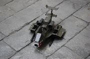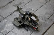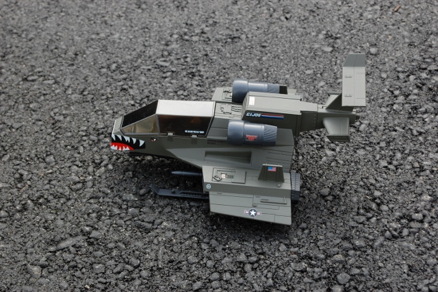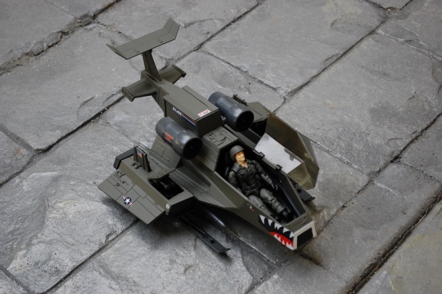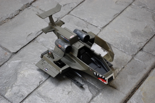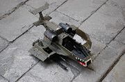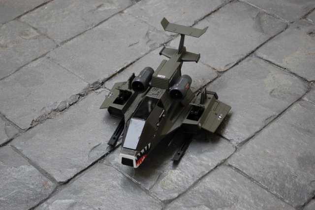 I know there is already a Sky Shark but this is actually made from a Sky Hawk and a Shark. I wanted to build something modern yet classic looking. I started with the Sharks and the first this I did was add in the Sky Hawk seat so the figure could sit upright. I then cut the Tail wing and added it to the back of the Shark. This made it a bit longer and it helps it look more like a plane. The rear stabilizer wing had been previously glued on so I just left it. I added the engines, landing gear, missiles and chin gun all from the Sky Hawk. I painted it a WW2 olive drab and added the classic Sharks mouth to the front.