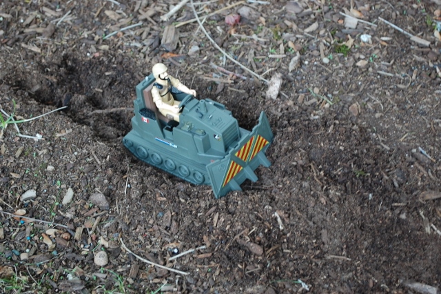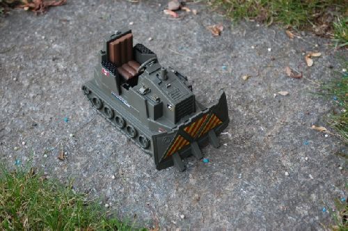 There is actually a fare bit of work in this small vehicle. The Weapons Transport vehicle is mounted on a set of Armadillo treads that were attached to a scratch built base with the original rolling wheels underneath. I also made side steps for the drivers feet to sit on. The front shield or plow is from the Bomb disposal vehicle and can be removed. The steering wheel is from the Cobra Moray. It's finished in Krylon olive drab.