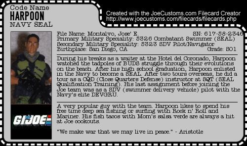 Jose' Montalvo was the Navy representative for the Extreme incarnation of the G.I. Joe Team. He comes into the ARAH continuity as a former DEVGRU operator and SDV pilot. Harpoon can covertly deliver Joe SEALs to places other Joe subs can't reach. As a fully qualified SEAL, Harpoon is an asset to the small squad of SEALs embedded with the Joes. His time with DEVGRU makes a top choice for hostage rescue missions. Can often be found catching waves with Rock n' Roll and Mariner in his off hours.