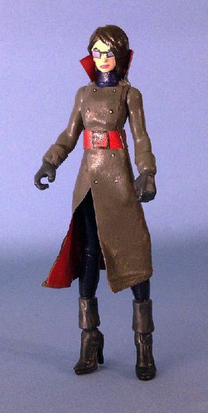 The glasses and hair are sculpted of epoxy. The long coat is sculpted from paper/tape. The tiny feet and boots of the Raven figure were replaced with larger ones, which helped supply the lanky look seen in the cartoon. Although the female characters in Renegades were drawn as slender/athletic, they weren't given superhuman or impossible proportions. To match this, the exaggerated chest of the Raven figure was toned down to a more realistic size.