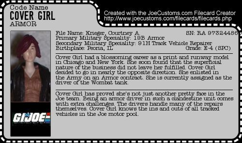 Cover Girl is the runway model turned tank jockey of the G.I. Joe team. I like to think her no nonsense attitude inspired Shipwreck to undergo SEAL training to prove he was a better man than his love rival Clutch.