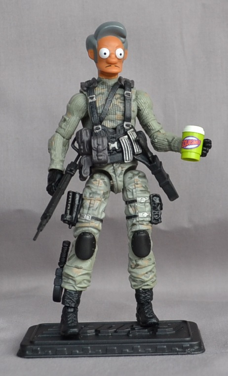 Apu Nahasapeemapetilon was contacted by GI Joe after he was seen on the news several times defending his store from would be thieves. He did extremely well in initial training where he excelled at weapons handling, hand to hand combat, stealth, psychological stress management, and withstanding sleep deprivation. Physiological studies also found his body able to sustain itself on little to no nutrition. He would be an ideal soldier to send into hostile enemy territory with little supplies. It appears the Quickie Mart was an ideal training ground for a soldier both mentally and physically.