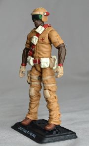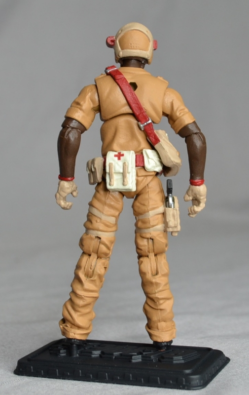 In trying to come up with a figure to do for our desert mail away set, I kept coming back to Doc. I had been wanting to do a modern version of this character for a while and he seemed to fit nicely. The hardest part here was making a modern medic helmet. I originally planned to just use glasses, but delays in receiving a casting order pushed me in another direction. I tried a lot of different things before figuring out to cut the faceplate off a Steel Brigade Delta helmet and add the glasses from Renegades Ripcord. I thought it looked like something a modern medic would wear so I went with it. For the rest of him, I tried to take cues off the original and just use more modern parts options.