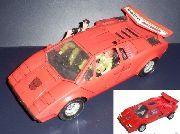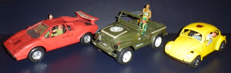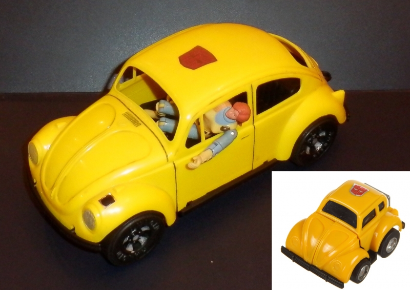 Tootsietoys Lamborghini Countach, Gay Toys Jeep, Amloid Volkswagen Beetle, panel lined black and gray, black paint for Bumblebee, Cobrastickers Hound VAMP jeep stickers and Autobot insignia stickers