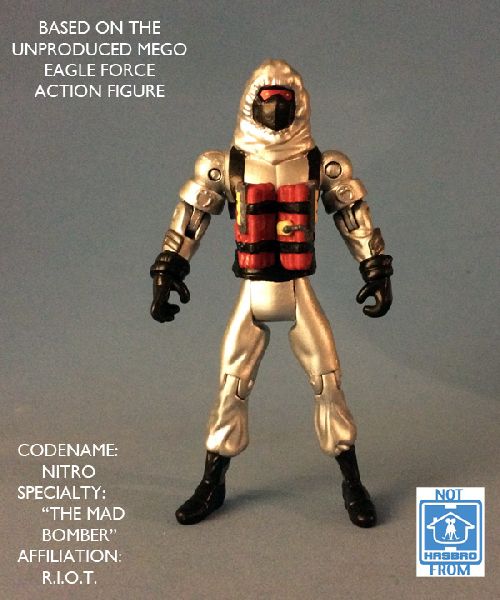 Nitro was listed as a villain for the cancelled RIOT wave. According to megomuseum.com, he was to be "swathed in sticks of dynamite". Without much other description, and no illustration, Nitro was open to interpretation. The explosives (dynamite from Trendmasters' glorious Battlefield Earth line) are the centerpiece attached to the chest and the back.