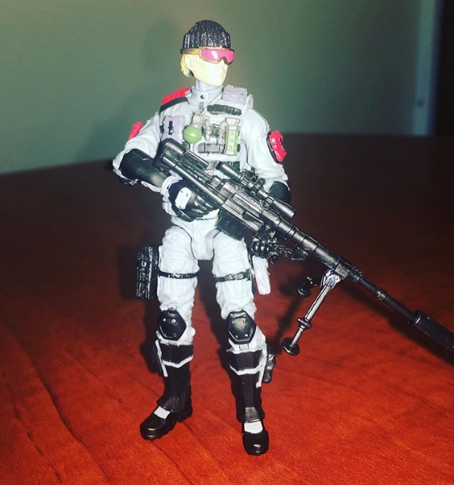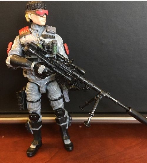 The OG Low Light was always one of my favorite figures. His gun and his look was one of pure bad ass. So when Hasbro put out one for the POC line, I dropped $30 to secure him on eBay. That figure had a TON of great gear. But I felt was inferior due to the fact he couldn't hold his own sniper rifle. So I custom made one that CAN! MTF figures are great at holding their weapons. So I did a basic grey/black theme with some red splashed in for color. I modeled him on the OG Low Light.
