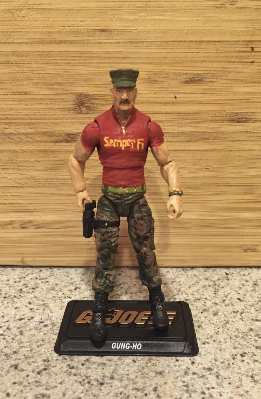 I wanted to have a more casual look to Gung-Ho with this custom. What would he look like just hanging out at the PIT or on the range. The red shirt wit the Semper Fi logo needed to be placed on him. I feel subtle was the way to go with this version. The initial decal was very poor looking and had faded quickly. Using a jewelers lens and a fine tipped brush I was able to trace the letters in yellow and go through the gaps in red. This really brought out the logo and , I feel, made the custom.