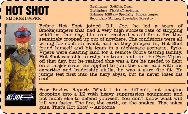 Smoke Jumper is an interesting occupation. You jump out of an airplane into a forest fire, with the intent of putting it out. Makes a good basis for a Joe character. The 12" line produced a smoke jumper figure awhile ago, that I used as some inspiration for the build.