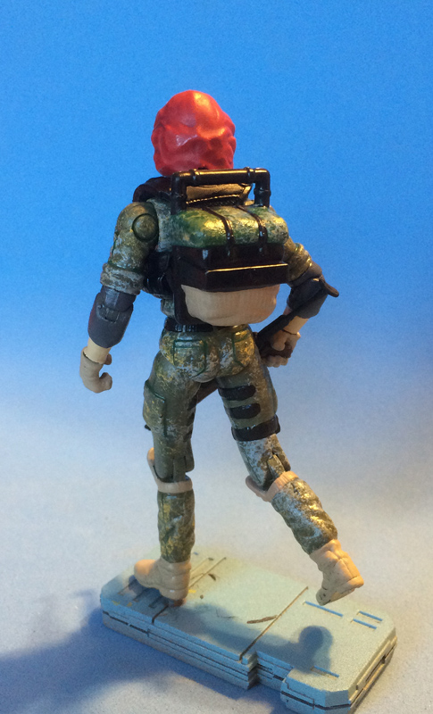 The screw insets in the thighs and the elbow hinges were epoxied smooth. The sleeve edges, leg pockets, and the bottom of the backpack are sculpted.