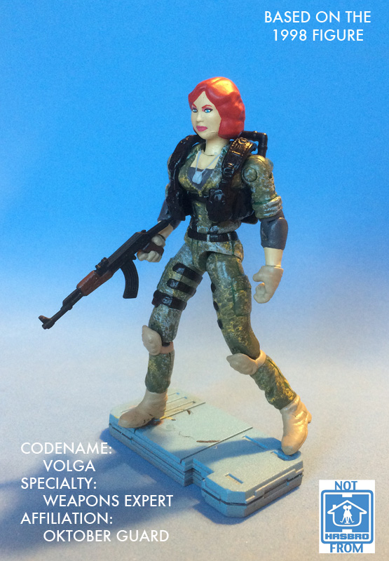 If GI Trekker sees Volga as a different character than Daina, that's good enough for me. After all, it was his work that lead to the creation of the character for Hasbro! There were obviously very few parts to utilize for the '98 line, so the original Volga figure was essentially a Lady Jaye repaint with a new head. The Adventure People head is an imperfect cast, calling back some of the sad sculpting of the ARAH Volga head (I doubt that Hasbro intentionally sculpted an ugly head). The rest of the parts recreate a look similar but not identical to the original figure.