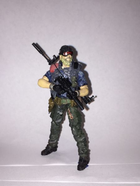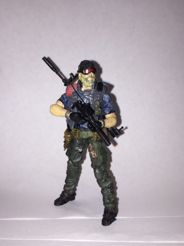I used Green Stuff for the beard and leg wound. The torso is a Kwinn torso. I love that figure. The legs are from a Retaliation Flint. I used the verst of POC Low Light. I opened it up and used green stuff (again!) to even out the line of the vest. The arms are a 50th Dusty and the hands are from who knows.