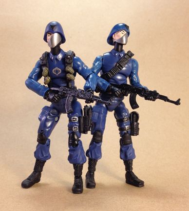 To help guard Cobra Commander in a high density area, standard Cobra Troopers aren't quite enough. The Parade Dress Division are outfitted with a malleable Kevlar that stops small arms fire and slows blade attacks. Add to that the half mask that may look stylish but gives constant electronic threat assessments and you have a class of soldiers who are quite efficient at guard duty. Even if they are too expensive for the field, they make a great recruitment tactic.