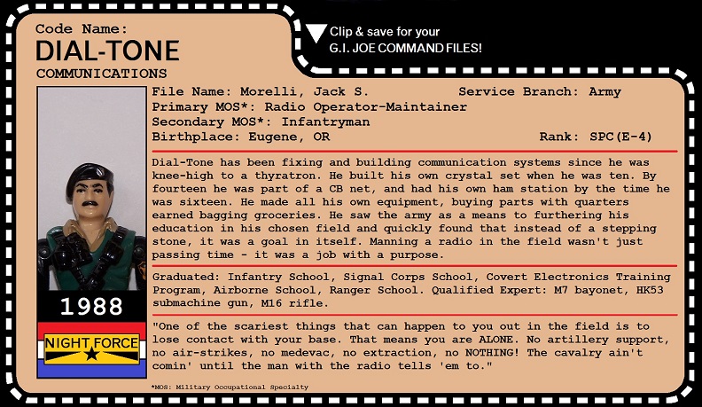 This is the Laziest of LBC customs. It replaces the arms of one 1986 Dial-Tone figure with the arms of another 1986 Dial-Tone figure (Special Mission Brazil). I once saw an eBay listing with a figure like this, where the seller didn't realize that the arms weren't original to the figure. But it looked really good to me, so I made one. His mostly-black outfit made him a candidate for Night Force, so that's where I assigned him.