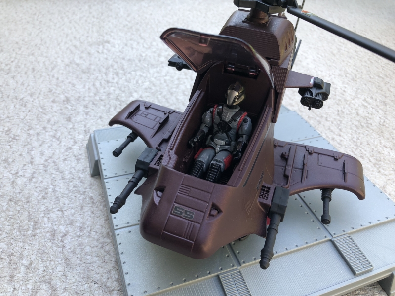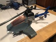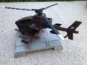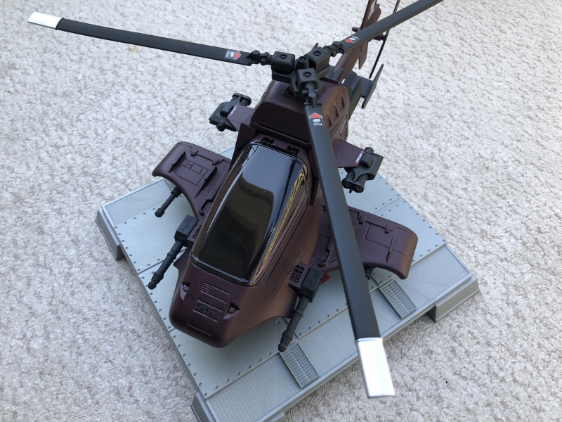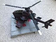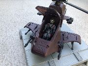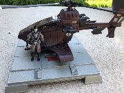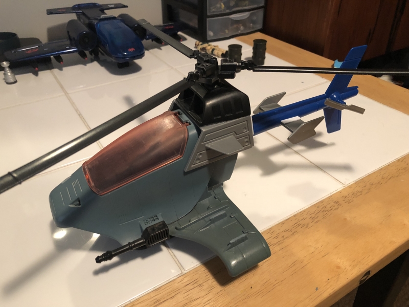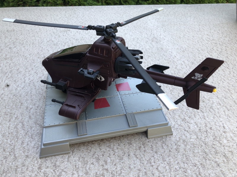 To me the Sea Ray looks like it should be a helicopter. I added a Tonka Choppers tail to the front of the Sea Ray, cut down the wings and fit them under the cab. I used two Swamp Masher wheels as jet engines and added a modified Iron Grenadiers chopper blades on the top. It also has a search light from the Tonka chopper, Battle Force 2000 guns, version two Rock n Roll guns. The whole thing sit on Arctic wolf skis. It painted a dark metallic burgundy that I think gives it a sinister look.