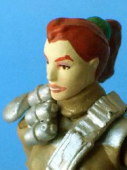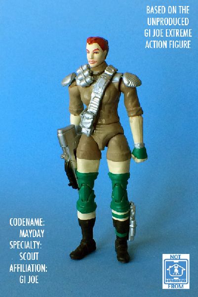 Unproduced in what would have been the next wave of GI Joe Extreme, Mayday would have been the lone female figure in the line. The figure's design, as seen in promotional material, appears to be bits of armor over fatigues. The great but tiny NS Jinx head stands in for Mayday, and 25A arms replace the dreaded NS shoulders. The female Marvel Universe legs allow for the Lara Croft-like short shorts and boots, although Hasbro should have hidden the pins for the knee hinges.