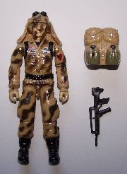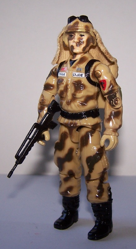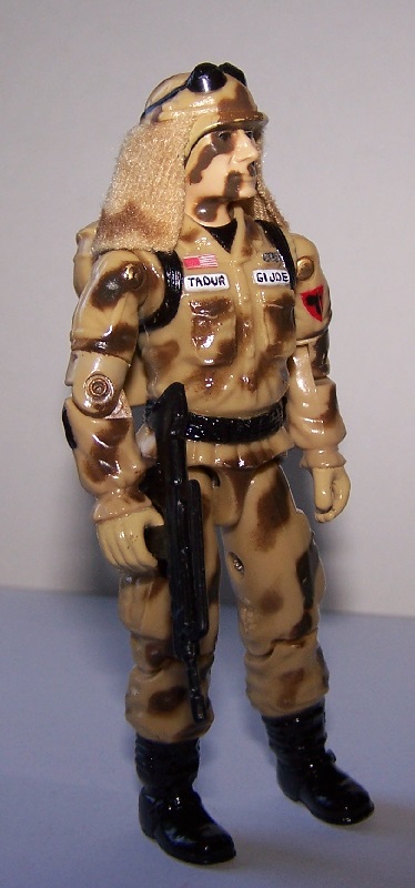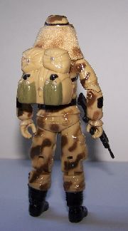 Dusty v1 was always one of my favourite figures growing up. Not sure why, but I think his realistic outfit had something to do with it. And his bullpup rifle, of course. His shirt has some details on the chest which I've painted here to give him a bit of an upgrade. First was to paint his Parachutist's Badge silver instead of black. Then he has two patches above his shirt pockets, but on the original figure they're left blank. His card art shows that the right patch shows his surname (Tadur), but the left patch can't be seen. However, Special Missions #13 showed that patch saying 'GI Joe', so that's what I've done here. I used a Pigma Micron pen to write in that information on the patches. I also painted some details on his backpack.
