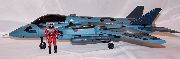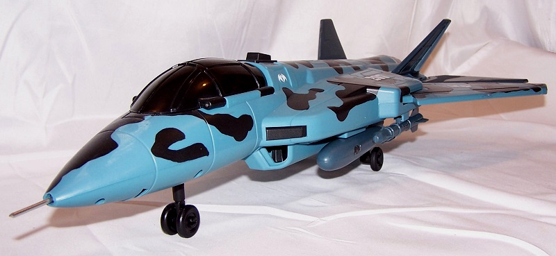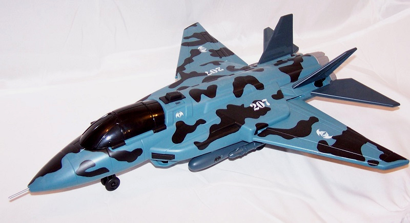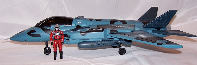 The True Heroes Truhawk is a pretty cool swing-wing jet, and since it has a blue base colour and doesn't represent any real-world fighter, I assigned this custom version to Cobra. I repainted the camo colouring to make it a bit more striking, removed the lights and the ejection mechanism (just because it's way too eay to accidentally activate it) and added some Cobra stickers. An aluminum rivet in the nose makes a convincing pitot tube. The pilot is the Air Viper. The name Talon II comes from the fact that the Cobra jets that appeared in the first episode of the original mini-series (The Cobra Strikes) have been referred to as Talons, so this is the successor to those planes. And as soon as I figure out a good way to make a Joe-scale F-102 Delta Dagger, Cobra will get their original Talon too.