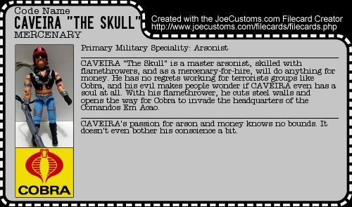 This one is of Caveira "The Skull", Argentinian Torch. It was translating its filecard that I really found Caveira interesting, as it turns out he's not a Dreadnok but a mercenary, which gave him more character.