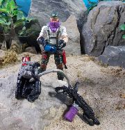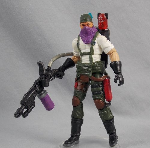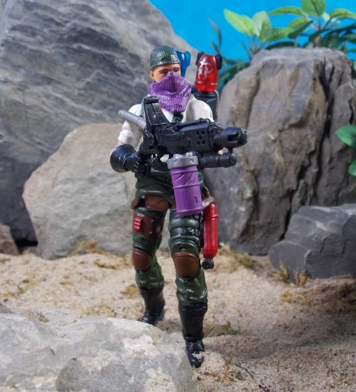 I've been playing with a Left4Dead/COBRA inspired diostory idea for YEARS, and had the original version of what would become DISCHARGE sitting in my WIP box for almost as long. I like the idea of a TOXO-VIPER with just the lower half of his gear on. When this project came up, he seemed like a good fit, but it wasn't until I asked for some name suggestions and Bucky came up with DISCHARGE that it all came together. It was perfect, a little gross but also a great double meaning. I decided he was just about the most unlikable person ever, and is always getting kicked out of anything he joins. The chemical pack was a fun, lets just glue tanks and hoses together and see what happens project, and I added the purple scarf as a callback to his TOXO-VIPER history.