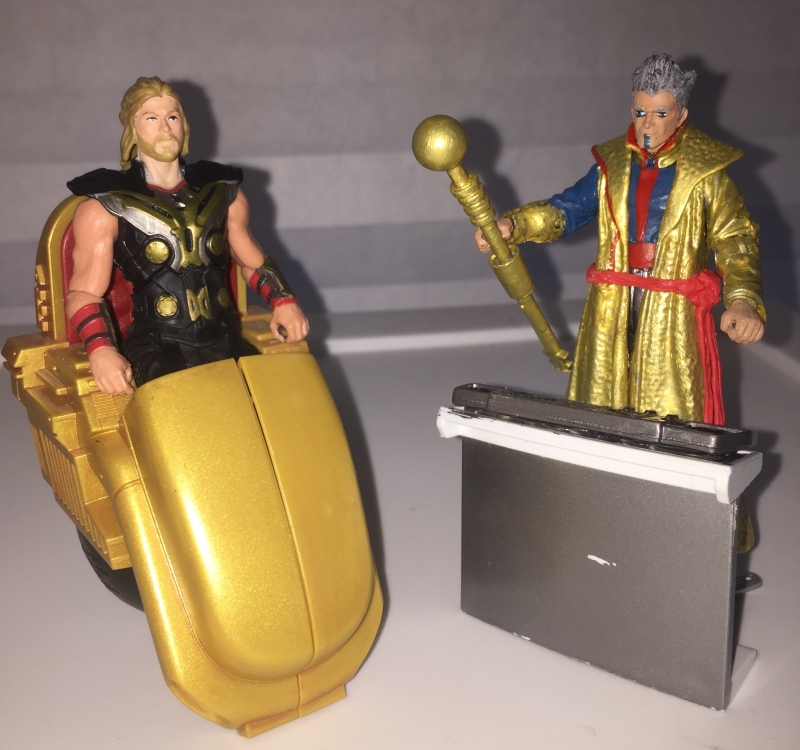 I'd joked about sticking a Jurassic Park Ian Malcolm head on a Last Jedi Snoke figure to make an LBC Grandmaster. And that is where I tried to start with this until I a) saw how bad the Malcolm headsculpts were and b) how much the 5 PoA Snoke figures are going for. So I started piecing together a custom that could stand next to the Ragnarok Thor figure and look like they belong with each other. I know the likeness isn't perfect, but there is no good way to capture the Jeff Golblum whimsical magic. Thanks to Kilcarr, there was an attempt to match the crazy hair.