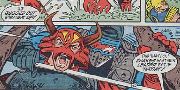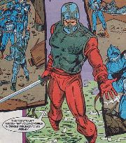 In a number of issues in the 120s of the Marvel comic, a group of Red Ninjas appeared who were led by a warlord, once referred to as the Red Master. Ultimately it was revealed that the Red Master was actually Firefly. This custom represents the Red Master both before and after the reveal, which is accomplished with a simple head swap. I had an established recipe for a Red Ninja, which formed the starting point. Knowing I would be using a Firefly head, I would need a 1983-84 era torso with some body armor on the front and back. Tripwire was the obvious choice, but his back isn't actually fully armored. But Major Bludd, whose front torso isn't as good for this figure as Tripwire, is fully armored on the back. So I decided to use Tripwire's front torso and Major Bludd's back. The Red Master head is Bushido - I did some precision Dremelling to cut the neck down to a swivel joint.