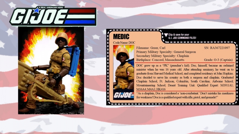 I think Hasbro messed up on his file card though. They list Doc's 2nd MOS as "Chaplain's Assistant" which is basically a gun-toting bodyguard for a Chaplain. Yet, Doc is portrayed as a non-combatant. How can he be a non-combatant when he's suppose to protect a Chaplain?