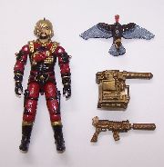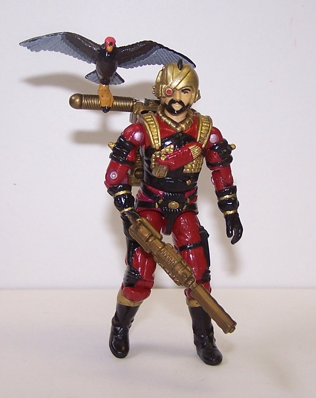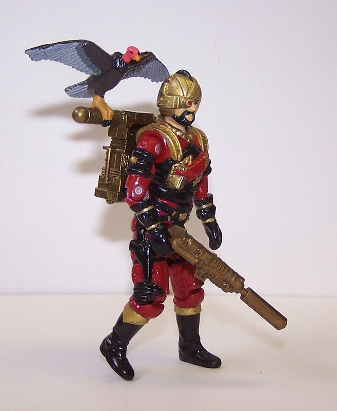 Destro and his Iron Grenadiers sport a very strong colour palette: red, black and gold. This allows for some very striking uniforms for his troops. So when you see Voltar with his black and gold highlights but purple uniform, you wonder what happened. That purple needs to be red to make it more uniform with Destro's other soldiers. This custom is a repaint of the original figure, replacing the purple with (mostly) red, and painting more detail as well. I also painted his bird, to give the turkey vulture more accurate colouring.