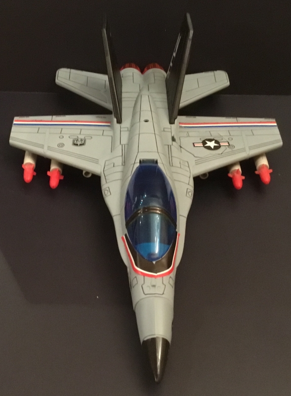 The Trendmasters F/A-18 Hornet is a nice little jet, but the green camo and long black nose cone has always struck me as being a bit goofy. So I acquired one, and took it apart, painting the top half of the jet in the more traditional gray color. I also painted part of the nose cone the same color so it would appear shorter.