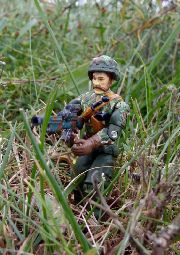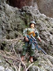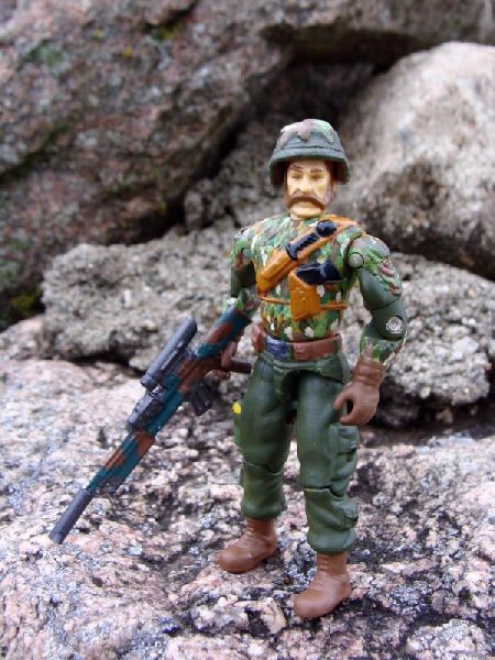 Ambush is on of my favorite figures from 1990, and as I began expanding my Battle Corps lineup, I knew I wanted to include him in. Ambush is the teams resident concealment specialist. As typical with Battle Corps figures, I scaled back the personal accessories and gave him just a rifle and a helmet. His rifle is custom made from various parts.
