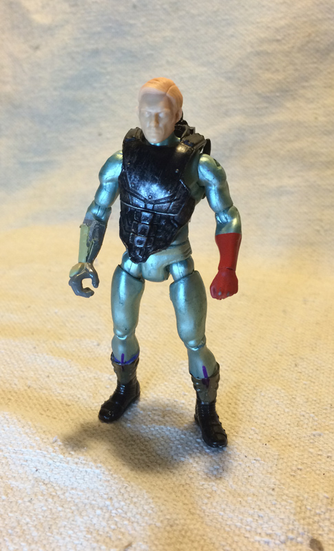 The head is cast by starwarsgeek.com. The Captain Atom right hand and lower legs were chopped off, replaced by the Sand Viper arm and Desert Claw boots. A hole was drilled in the back for the backpack peg.