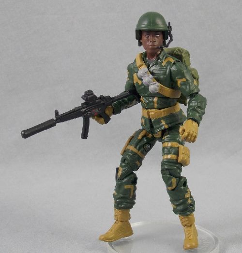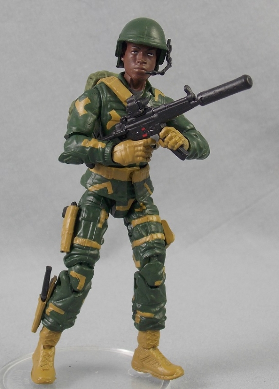 For Bullet-Proof, I liked the head and torso of my original, but the helmet, arms and legs needed an upgrade. I swapped all those out for newer parts. I also repainted the green to a darker shade and redid the camoflage pattern.