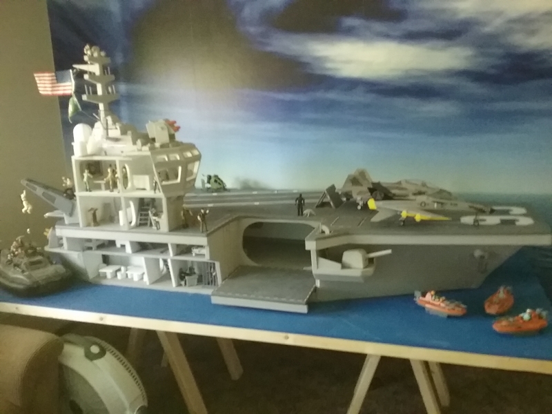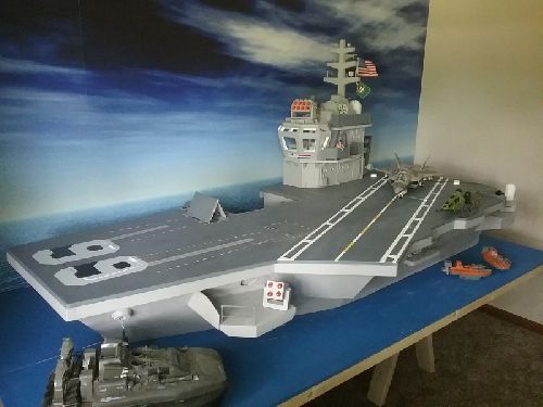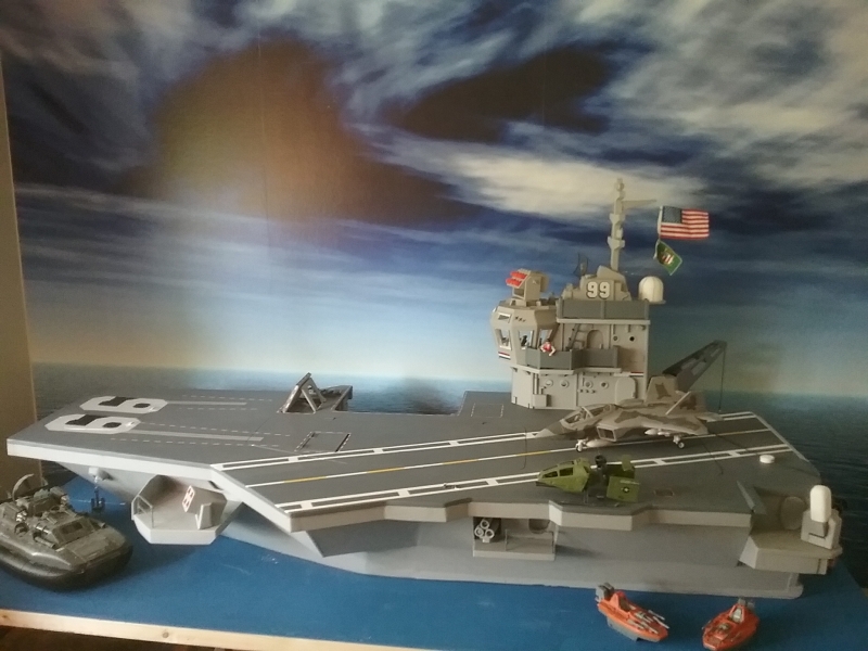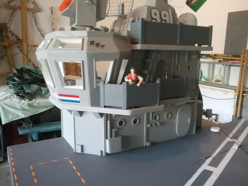 I used the stickers and anchors from the original FLAGG. The rest is made from wood. I wanted to buy one my whole life and never did. I decided to make one and added in more play value. I designed the deck to launch two planes and not just one. I also added a hangar deck below the flight deck. There's also a well deck on the back to dock the W.H.A.L.E and two devil fish. The crane works and so does the torpedo launcher. I just made it air powered. It has about the same footprint as the original toy but with below deck play value. The front has a panel that lifts to raise and lower the two anchors. I tried to mimic the Flagg aircraft carrier design but only the stickers and anchors came from the toy. Please look for more on imgur as well as YouTube. Just search custom G.I.Joe Flagg aircraft carrier.