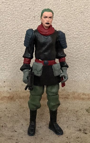This figure started as a Ninja Force Scarlett, which would have had her in a gi instead of a swimsuit over a wetsuit. Then I shifted it to being Scarlett in a cold weather uniform. But something about the Rey head felt more like Zanya, so I added on the Stalker dreadlocks and some pouches to take it in a different direction.