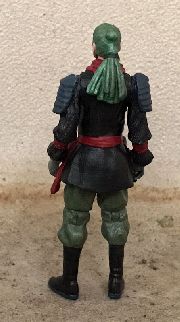 The head is cast by starwarsgeek, and I glued the Stalker dreadlocks to it. The neck is a thumb click portion of a pen, glued into place. The shoulder armor are push molds. The hands and boots were chopped off and replaced with Jonny Quest parts. The midriff area is epoxy sculpted to fill a gap.