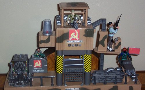 My custom Dragonsky is manning the mounted flamethrower on the right side. Soviet Super Spy, Stirlitz is on the lift on the right and you can see the others manning the vehicles. The Soviet Counterparts of G.I. Joe have now a base all to their own.