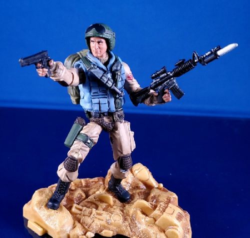 Time is kind to some figures and not so much to others. The 25th Anniversary Airborne was great when it first came out but as time marched on I became more and more unsatisfied with the proportions, the parts, the vest and how so many elements of what I loved about the Vintage figure were missing here. I remember seeing the tan contrasted with the light blue tactical vest and thinking as a kid "I NEED THIS FIGURE". I had made a Joe vs Cobra version back in the mid 2000s and it bugged me that I felt that O-ring style figure was better than a modern one. The biggest challenge was in figuring out what I wanted to do with the vest. Sculpt it with the articulation point showing or could I find a tight enough fit to function as a pull over for a smoother look. I thought back to how much I liked the look of the vest from Rise of Cobra Breaker and quickly scoured ebay for an affordable version. After that I looked I broke down what parts of the 25th Airborne I liked and those that I didn't. I realized that I mostly needed to just change out the torso piece and once that was done many of the proportion issues I had ended up working out. I grabbed a 25th Anniversary Beachhead torso and tried out the parts. Perfect. I did need to sculpt his collar as I wanted a high ribbed collar like the vintage figure. I also then cut down the front of the web harness from the 25th Airborne figure and after thinning down it's thickness glued it to the new Breaker vest. Lastly I sculpted out his blue collar neck piece and finished it off by sculpting the rest of the harness pieces, marrying them up to the pre-existing 25th harness piece. I then realized how much I disliked the harness that the 25th anniversary Airborne came with. In looking at the vintage figure it made sense to me to just sculpt it and not worry about it be removable or not. I had this figure with the 25th anniversary helmet as well all the way up to a few days ago when I found an old extra weapon pack Airborne helmet. I test fitted it, sanded down the seem and painted it up. Finally I decided that I wanted boots closer to those of the vintage figure as well and found a pair of 25th anniversary Dusty boots. Threw in a set of Marauder gloved hands and a backpack that resembled the vintage, American Flag, and Stripes and there we go. Very happy with this guy now.