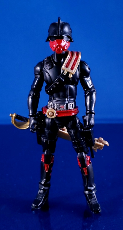 I really liked the idea of the Iron Grenadiers, Destro striking out on his own. Holy crud could you imagine what this would have been like had Sunbow handled this storyline. Man. I really liked the original designs of the Iron Grenadiers and felt the 25th figures just missed the mark. Although I could buy that Destro outfitted his troops in a stripped down version of Cobra Commander's battle armor the character went from looking streamlined to bulky. I didn't like it. When I started thinking about this figure I was pouring through tons of pictures of the Iron Grenadiers, everything from official to fan art. I came across some of the original card art and realized that the character looked like he was wearing a tight body suit. I grabbed a spare Torpedo and started to quickly cobble it together. After modding the knees to fit into the upper legs of Torpedo, I was amazed at how much better this looked for me. A call back to the original figure's design but with a modern and more grounded feel. PLUS the silhouette of the character was lean and tough looking, something that made sense to me based on how I felt Destro would have his Trooper's train. I'm so happy with this I'm going back and altering all of my Iron Grenadiers figures right now, with three done and the final two left to go.