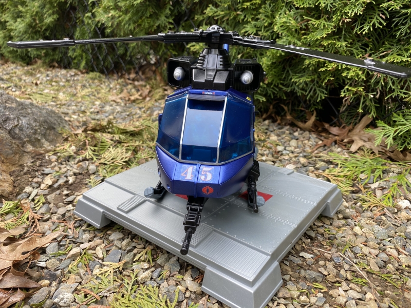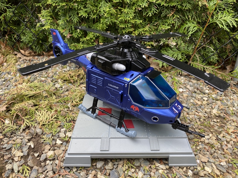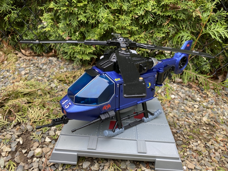 I found this TRU helicopter at a thrift store one day, unfortunately missing the opening side door and the winch. the great thing about this is it opens and you can fit four troops in the back. I built a opening side door out of styrene and added Tomahawk seats inside for the figures and a chin gun and side cannon. I mounted a set of Rattler bombs underneath and used a Dragonfly hook on the winch. Then I painted the body a nice metallic blue with a black engine and blades. The canopy was tinted a darker blue and I added chrome trim around the window. This is my favorite custom helicopter so far.