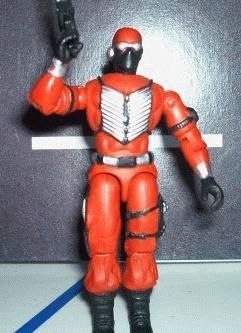 Crimson Guard Nitros are the personal bodyguards of the Twins and Cobra Commander himself. The are culled from the ranks of the Crimson Guards and injected with a special chemical developed by Dr.Mindbender. Calling his new potion ,"Nitro" , he injected it in to several loyal Crimson Guardsmen. Now those CG's are dependant on the drug. When they hit the release button on their leg , the potion is injected into their veins , causing their muscle mass to increase by 50%! However , their brain mass reduces by 50% also. This makes these guys very strong , but very slow witted at the same time. Now that's a dangerous combination!