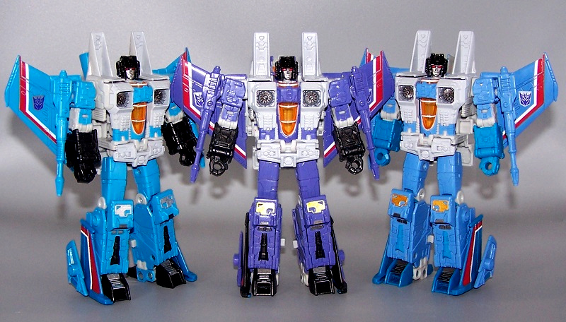 When the Transformers cartoon began in 1984, the Autobots had a significant numerical advantage over their opponents. For toys, there were 11 Autobot cars, six mini-cars, and Optimus Prime, for a total of 18 good guys. The Decepticons had Megatron, Soundwave and his five cassettes, and the three Seeker jets, for a total of 10. Sunbow Productions bolstered the Decepticon numbers in a number of ways in early episodes of the series, including the addition of "generic" Seekers; they had bodies in the form of Starscream/Skywarp/Thundercracker, but with different colours schemes and no names. A set of three more Seekers is therefore needed to represent these characters, but with names and personalities and everything. They are Crosswind, Nosedive, and Overshot.