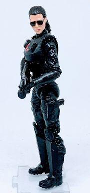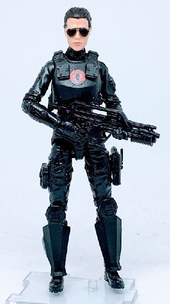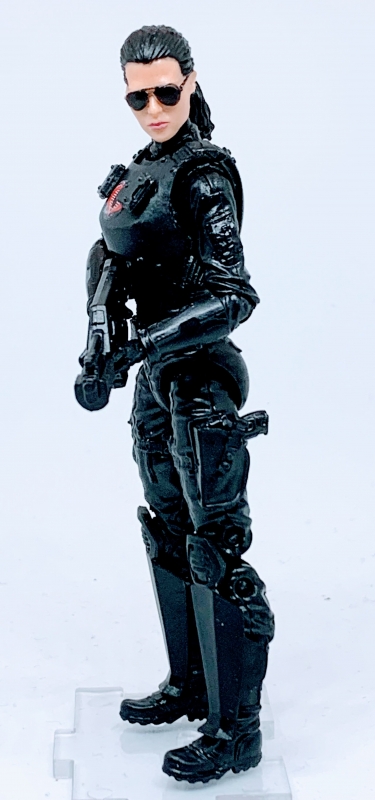There are more Baroness customs than there are grains of sand on the beach, so I knew there was no way to do anything that hadn't been done countless times before. I have a mandate to try to make as many Joe customs using only Marauders Task Force parts, however MTF does not make form fitting leather-looking female parts. So, I knew my Baroness would not be a vixen. In that case, I at least wanted to make her intimidating. I tried to use parts that would evoke two female action stars: Sarah Connor and Ellen Ripley. To that end, I didn't go for an actual Baroness head, but chose a head that had sunglasses and a ponytail. That took care of Sarah Connor. Unfortunately, the only call-back I could make to Ripley was the use of a Colonial Marine Pulse Rifle. I cut off the lower half of the armored vest to try to give the figure a more feminine silhouette.