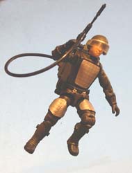 The JUMP jetpack was another challenge. I cut notches into both halves of the Fast-Draw backpack at the top, cut off the second handle of Charbroil's flamethrower (where the hose attaches), and fitted it into the notches. Then, I drilled holes in the sides of the Fast-Draw backpack and threaded a piece of HEAT-Viper hose through them and the Charbroil handle-piece. I cut up a couple of Grid-Iron rockets and the launcher, and glued them into place to form the exhaust jets. Then, I cut off the stock from a Recondo 03 rifle, drilled a hole for a BBI stock, and glued it in place. I also drilled a small hole in the rifle for a post, then glued the post into the hose so it could attach to the rifle.