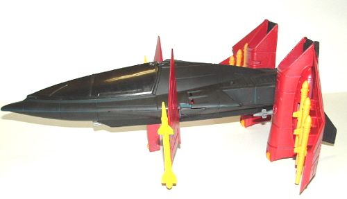 I got this Hurricane in a lot and wanted to do something with it. It was mainly a shell. Alot of things that were missing were the engine covers, upper rear wing, small drone, and missiles I had to fill in the top of the engines with mesh and bondo. It didn't look quite right that is why it is painted black. I don't know where the rear stabilizers came from. I added a six barreled "Vulcan" cannon under the cockpit for more firepower. I really liked some of the other Crimson air vehicles on this website and decided to do my own. Also I am thinking about doing a playset for the Crimson Guard.