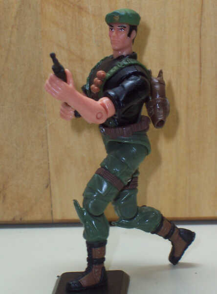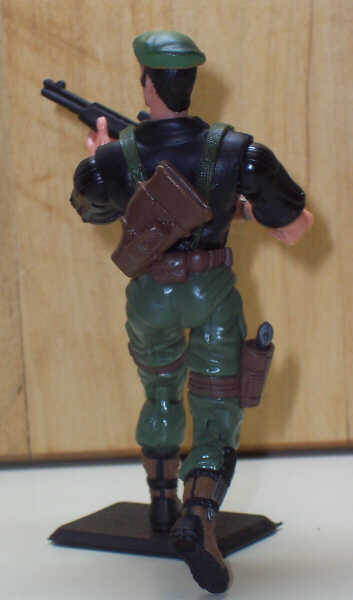 To make the t-shirt, I scraped off the Cobra symbol from Baldy's chest, then made that area roughly flat with green stuff. I had to wait until assembly for the suspenders, which came from two BBI belts which had their depending holsters carefully shaved off. These glue on both sides of the torso.