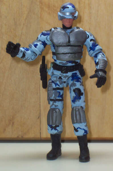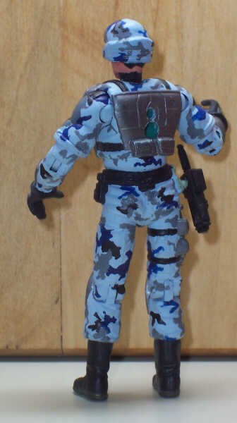 For the radio, I hollowed out a chap mei walkie-talkie and lopped off the knob end for Pathfinder's hip (the other I sanded completely). And I took away the arrow from the SAW Viper cast to make it look less SAW-like. From there, I tried using a blue-gray-black-white urban camouflage.