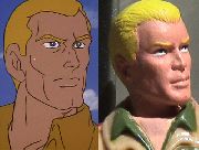 First up is Duke, my favorite Joe, based closely on his TV counterpart (in the second photo). He has a watch, since the comic pack version wears one, and his colors aren't exactly perfect due to my poor painting skills, but otherwise, he's as close to the TV show as I could manage. I've also included a side-by-side head shot of cartoon Duke and Comic Pack Duke so everyone can marvel at the magnificent job Hasbro did in bringing a 2D cartoon character to life.