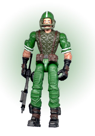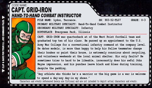 I figured I would pass on trying to make him identical to the original figure and instead inject as many football uniform qualities into him as possible. if you are going to have as lame a name as Capt. Grid-Iron you may as well be wearing a football uniform. went with the Roadblock torso and the Beach Head hands for the hand-to-hand combat instructor aspect of the character because the padding on them just have a sparring feel to them. The thigh pads on the Flint legs have a football pant look so they were a given, and I modded the Duke helmet with a paper clip for the face mask. Finally, the face is finished with black paint under the eyes and a breathe right strip across the nose.