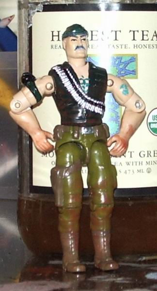 Well, I would feel incomplete without him on the battlefield, but I HATE the bright-red shirt. Gah, Big Brawler dresses better than that. So I painted it a dark green, then decided he could use some muddy dry-brushing along his hands, legs, and shirt. Then I got rid of the bald head, opting for a full bandanna instead of the little black napkin. Maybe I'll paint a Marine tattoo on the bandanna, if I decide that I care. Finally, I gave what hair he has a little grey dry brush, to make him look a little more distinguished. Like Solid Snake, but balder.